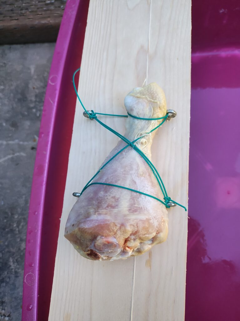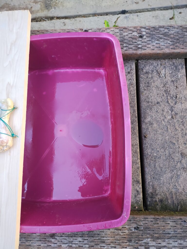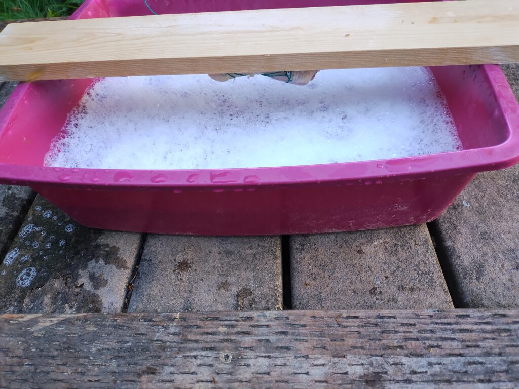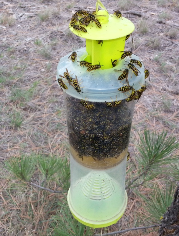 It is easy and inexpensive to create a Wasp and Hornet trap. All you need is a tub like a cat litter box, a board long enough to fit over the tub, a piece of chicken or fish (as bait), a bit of wire to attach the meat to the board and some water and dish soap.
